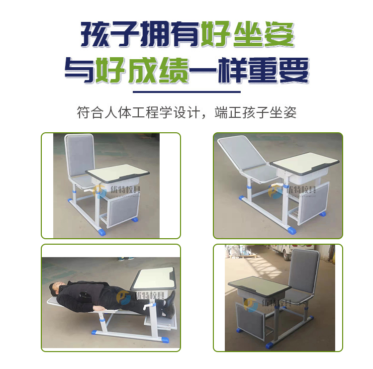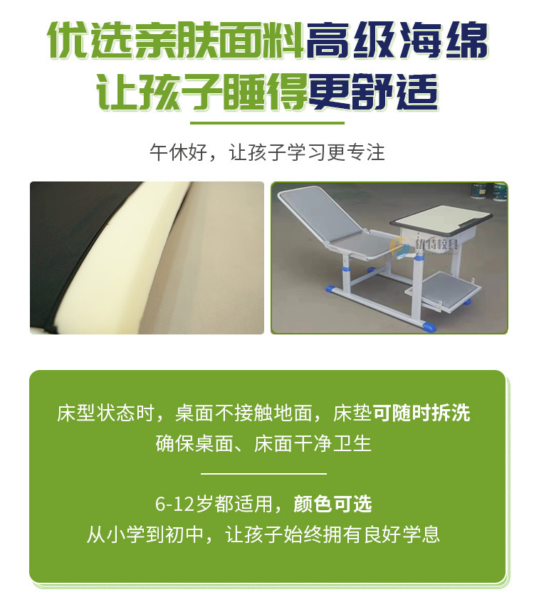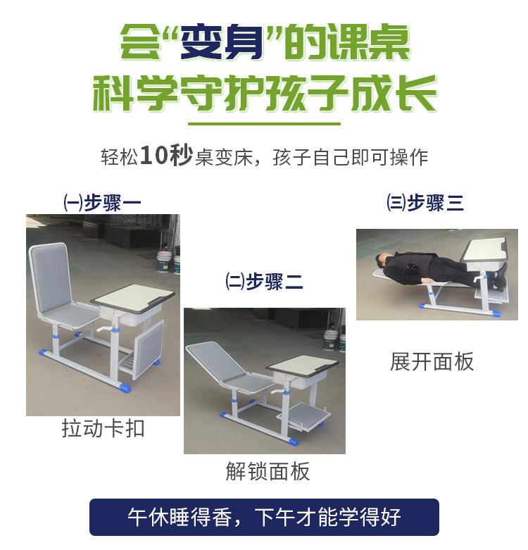 折疊午休課桌椅滿足日常學(xué)生學(xué)習(xí)書寫的使用功能,同時可以作為學(xué)生午休時的寢具使用,既符合人體工程學(xué)設(shè)計(jì)端正孩子坐姿,同時也滿足孩子午休需要,午休課桌椅的使用既節(jié)省了空間同時又為學(xué)生提供便利,可以滿足6-12歲學(xué)生的日常使用需要,可滿足小學(xué)、初中學(xué)生不同身高使用需求,同時加設(shè)海綿墊使用感更舒適。床型狀態(tài)時,桌面不接觸地面,床墊可隨時拆洗,確保桌面和床面干凈衛(wèi)生。同時平鋪和收納操作簡單單人獨(dú)立即可完成收合、打開步驟,讓孩子可以更好的學(xué)習(xí)和休息。