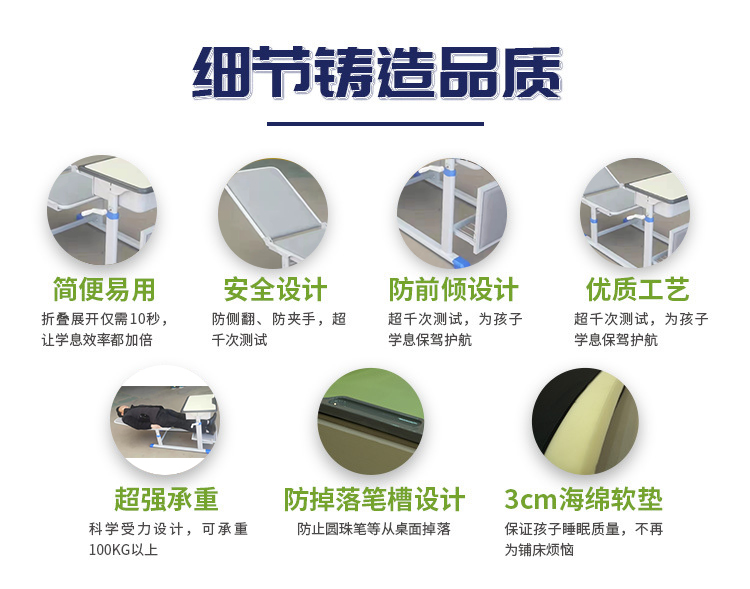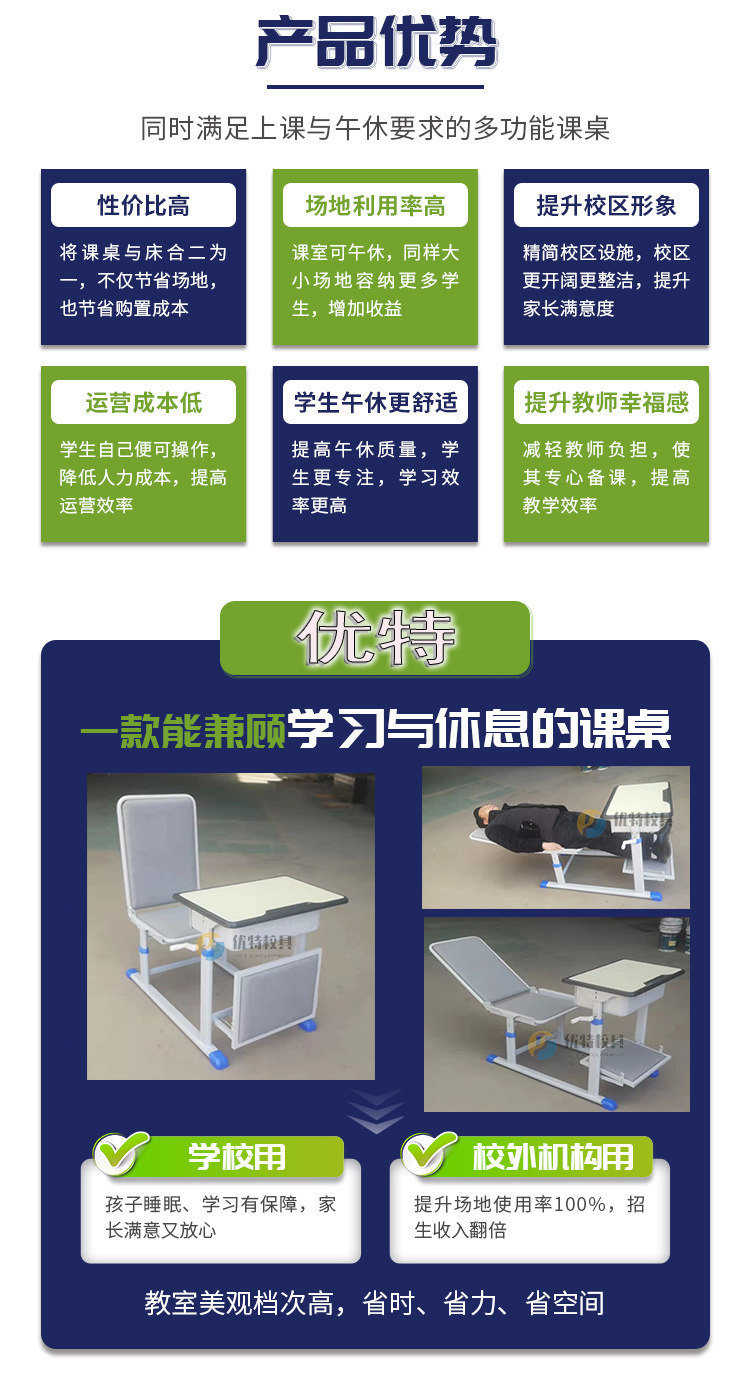 1、性價比高:將課桌和床合二為一,不僅節(jié)省場地,也節(jié)省購置成本。